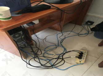 辦公桌電線雜亂,直接拖在地上,整體影響美觀,容易積灰,不方便打掃,且存在絆倒的風(fēng)險(xiǎn)。