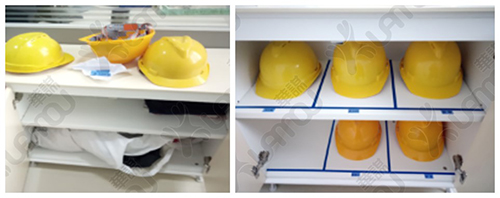 將安全帽定置標識,每個安全帽有固定的歸屬者,方便拿取及管理。
